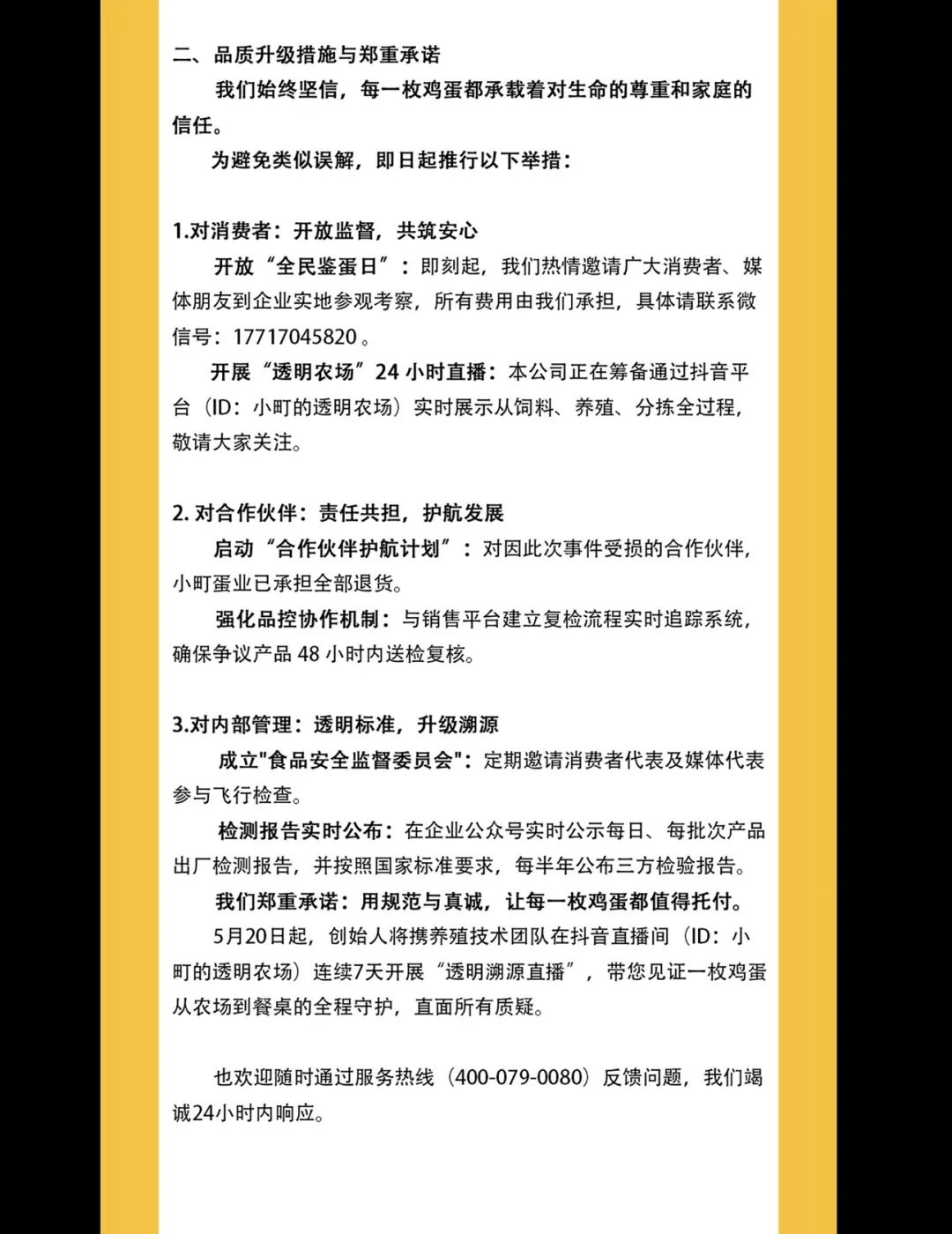 其强调,公司在3月得知抽检两项指标异常后,迅速将同批次留样送往第三方检测机构,结果显示合格。然而,由于某些流程等原因,未能及时按照复检流程提交申请,导致5月抽检结果公之于众。小町蛋业表示,公司终积极应对,已承担全部损失,并与所有渠道暂停合作,以确保问题得到全面解决。同时,公司正采取一系列品质升级措施,包括开放监督、透明直播等。