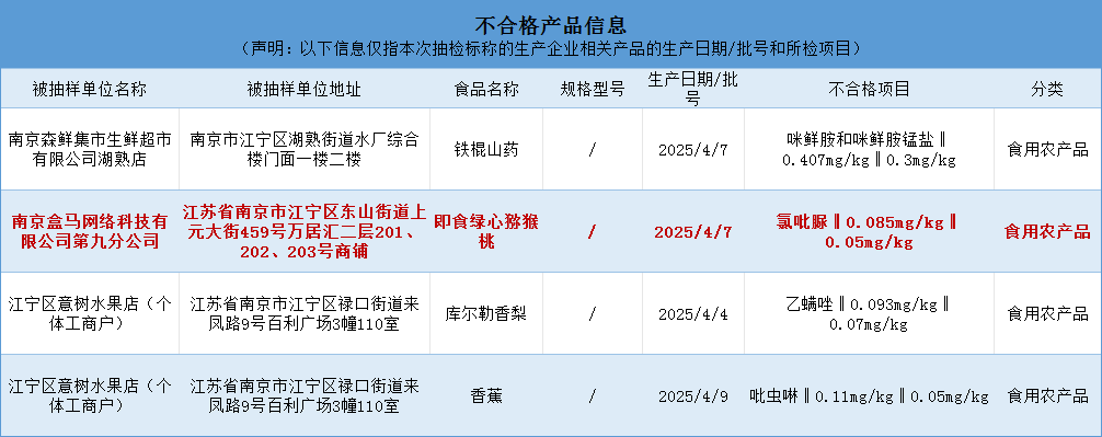 无独有偶,5月13日,南京市江宁区市场监督管理局发布食品安全监督抽检信息公告,抽检结果显示,南京盒马网络科技有限公司第九分公司销售的即食绿心猕猴桃(生产日期/批号:2025/4/7),氯吡脲不符合食品安全国家标准规定,标准值规定为0.05mg/kg,检验结果为0.085mg/kg。